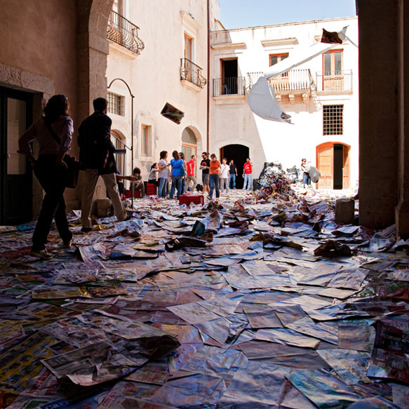Sepolto Vivo (Buried Alive) was a collective performance which was showcased in Syracuse, Italy, by Discarica Culturale. The intention of this demonstration was to exorcise the massive daily intrusion of advertising carried out by the large supermarket chains. So, over a period of two years, thousands of these leaflets were collected from an apartment block and stored. These were then used to cover the entire courtyard of the baroque Palazzo Impellizzeri.